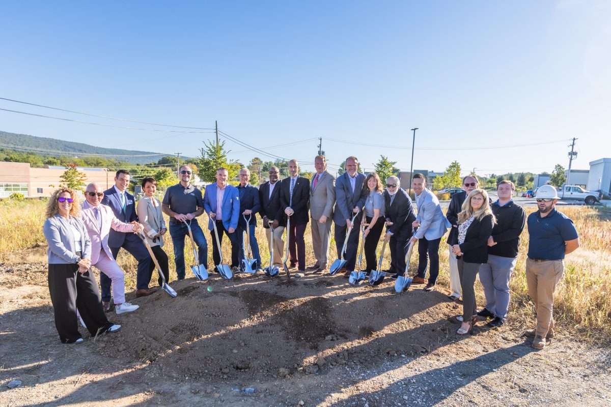 Groundbreaking took place in October 2025 and construction is underway. A full-service PSECU branch is the first business scheduled to open in Summer 2026.